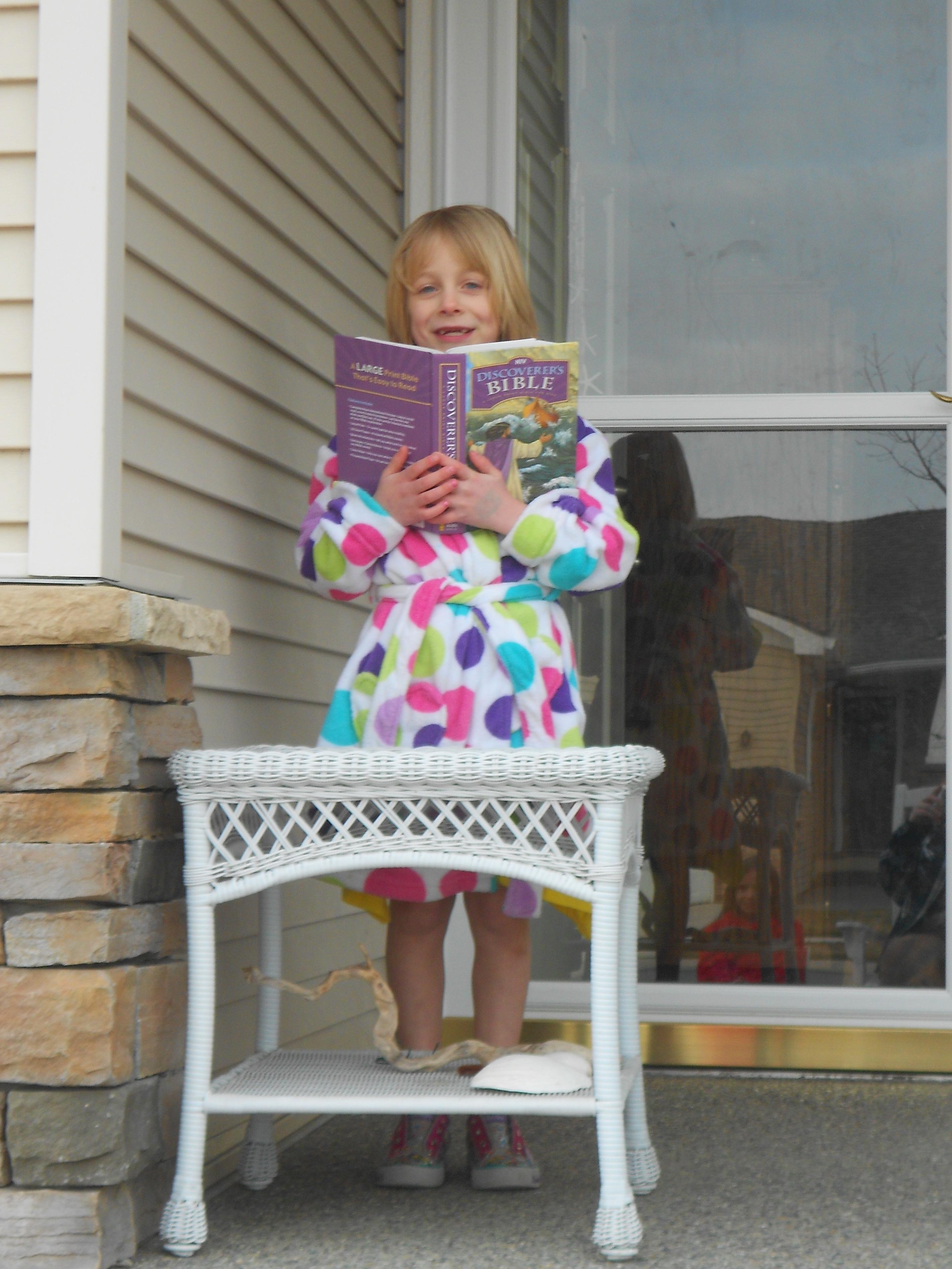 Then it was Abbey’s turn and she wanted to pick up where Emily had left off (sort of) and began reading about how Joseph when into Potiphar’s home and how Potiphar’s wife tried to seduce him. I’m thinking to myself, “Okay Abbey, you can stop here…” knowing that we’re embarking on a soap-opera-esque story about a married woman luring a young man.  Abbey reads that Potiphar’s wife says, “Come to bed with me…” and I am just dying (what does this have to do with poor little Fat Cheeks the chipmunk, and what are these young girls thinking of this tale?).  I start to say something but Abbey keeps going and comes to the point where the wife screams and tells guards that Joseph came to sleep with her. Finally, Abbey stops after it says “Joseph left his cloak and ran out of the house.”