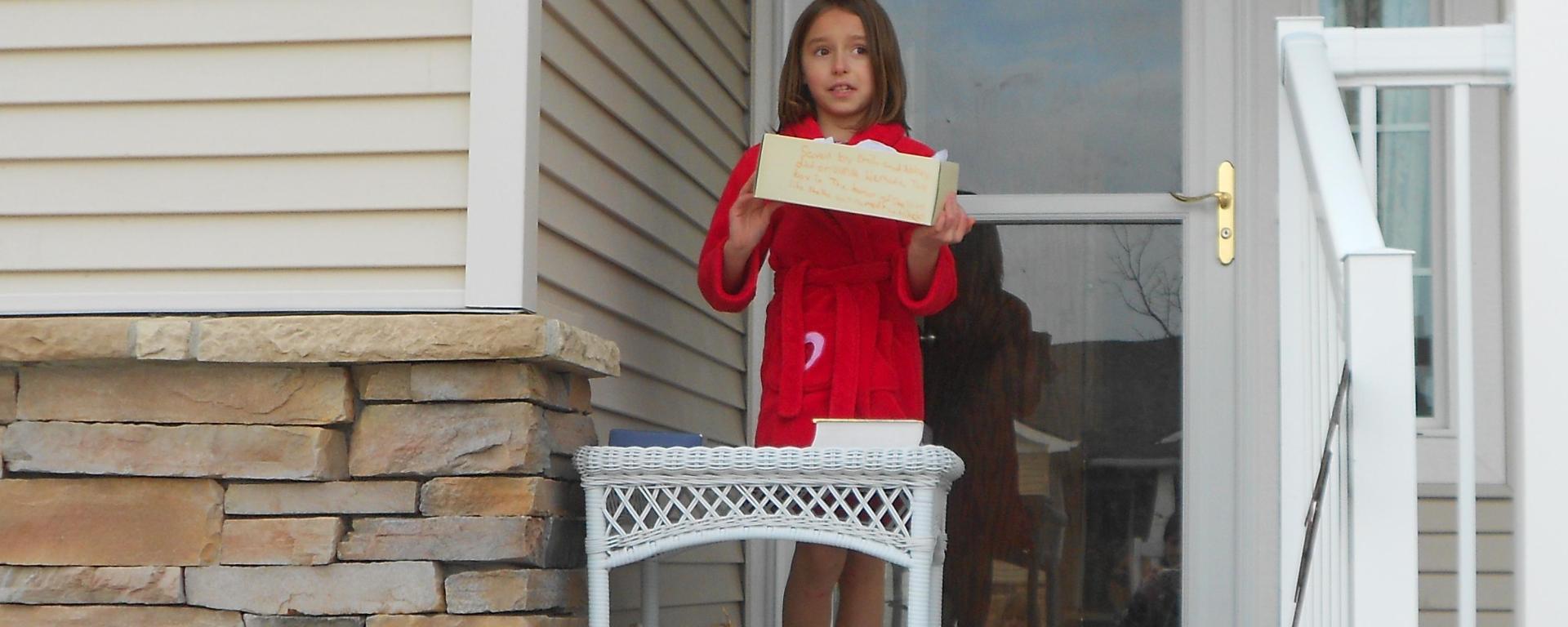 A good while later, they asked me to join them outside for a ceremony. The box was in the center of a hula hoop, Abbey was sprinkling rocks around it and Emily was parading around the hoop with a garden sign that says “Peace.” They had my rocking chair in the yard and had moved a table to the edge of the porch to be a pulpit. Abbey and I sat while Emily opened the ceremony in prayer for the Chipmunk they had named Fat Cheeks. For a scripture reading, she went to Isaiah where she read the prophecy of the birth of Jesus. She then launched into quite a sermon about how the Bible says we should care for animals. “In Genesis,” she said, and opened her Bible to Genesis where she ended up reading about Joseph and his brothers. When she snapped the Bible closed, she said, “Well, I don’t really know that that had anything to do with this chipmunk or about caring for animals. …. But … I hope that it made your heart tick anyway.” (What?!!)