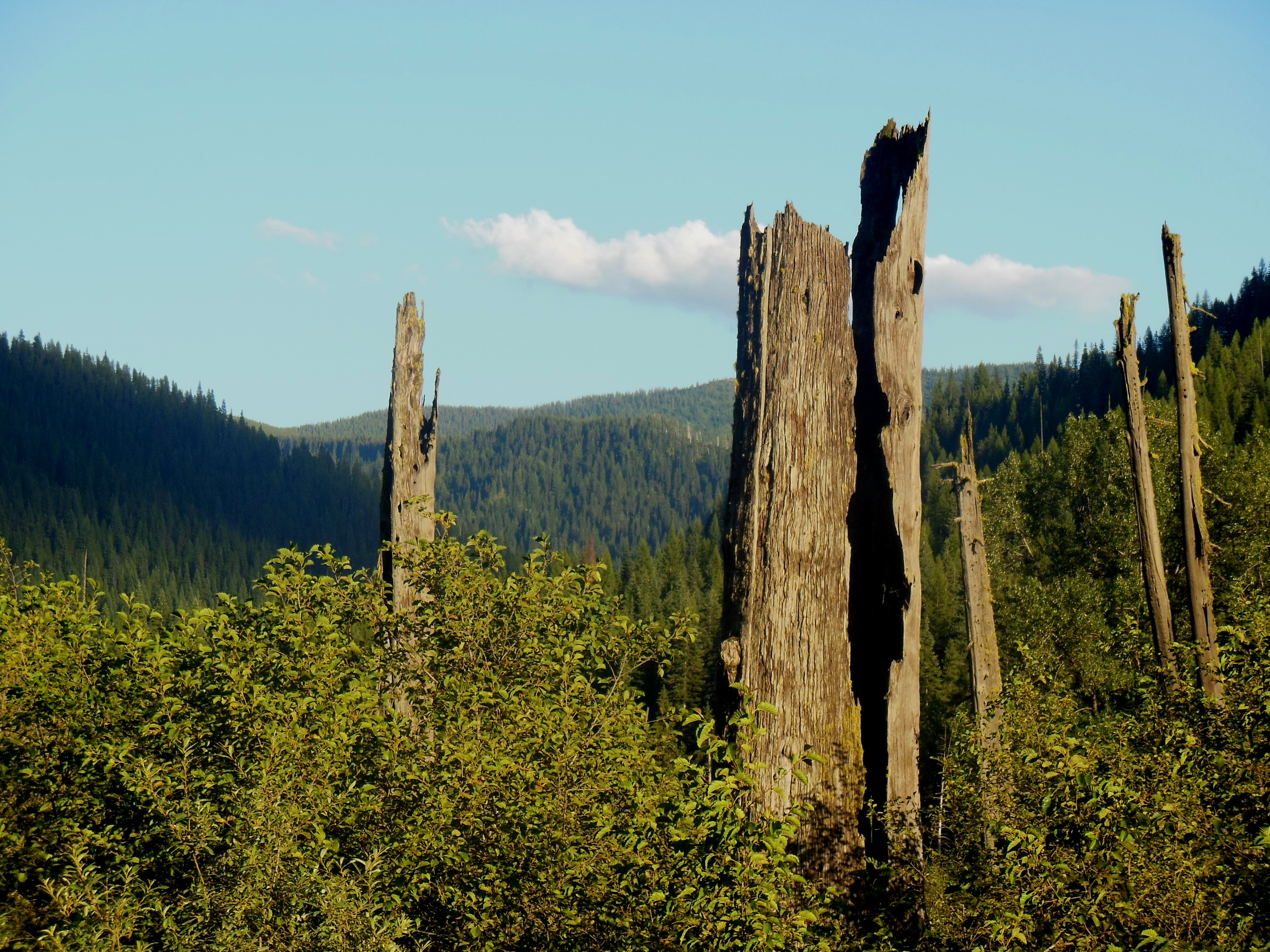 Then there are the ghosts.  The cedar ghosts.  Hollowed out shells of trees left standing since the big burn of 1910 when fire roared through the forest and the lives of countless acres of giants and dozens of human lives, too.  They were 300-500  years old when the fire scorched their trunks and snapped off their tops.  And here they stand – gray and cold and unmoving, but not dead.