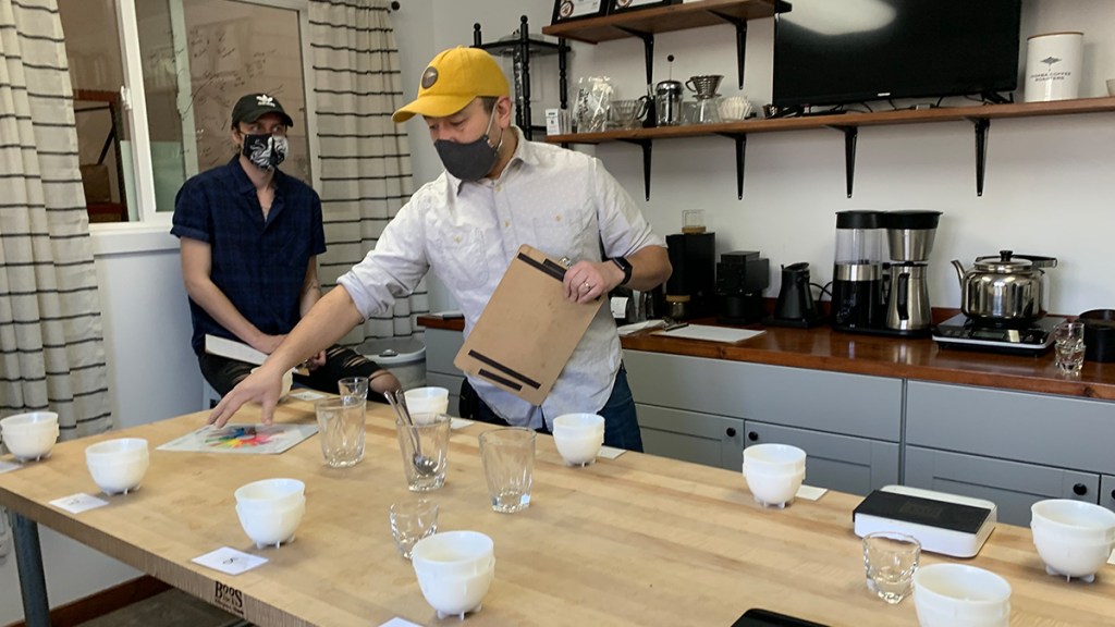 That synergy was apparent. Josh, perched on a stool, had the clipboard and a detailed chart for scoring 10 attributes of each sample, from aroma, texture, and flavor, to acidity, sweetness, and aftertaste. Wellenbrock and Crystal Walton called out their observations at each stage and Adrian handled the scoring.