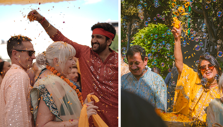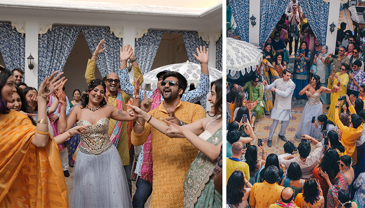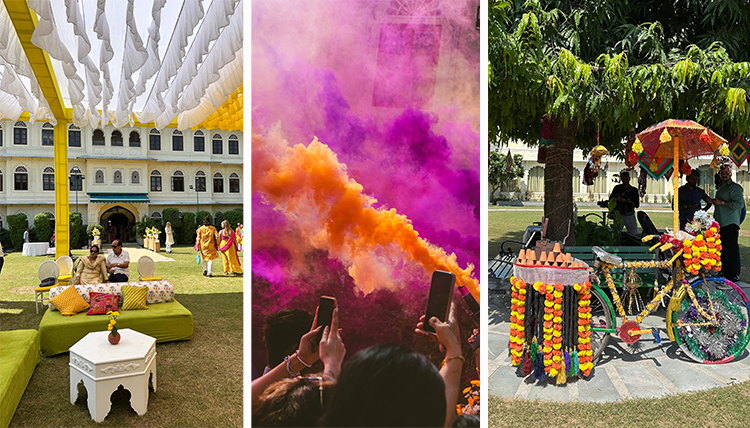 It wasn’t just the Uniara’s lawn that hosted so much beauty. For the Mehendi party, the terrace donned vibrant blues and yellows for dancing, drumming, drinks and party favors. The front entrance staged the groom’s procession in a horse-drawn carriage around the property, complete with drummers and a traffic-stopping scene. The rooftop setting was exquisite for the wedding ceremony – a flower-laden canopy for the bride’s entrance, a pillowy stage for the Hindi rituals, canons that shot red and pink petals, a fog machine for the couple to float on clouds, silver fireworks bursting off the rooftop. (The fairytale finale took place offsite – a nighttime soiree at a historic fort, with a meal at the queen’s palace.)